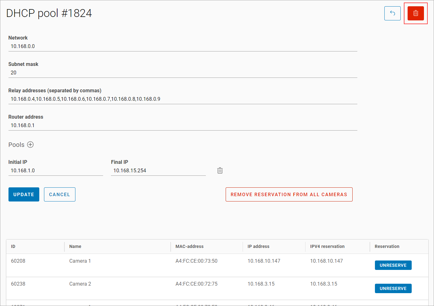 To delete a DHCP pool, select the Delete icon and confirm the action.