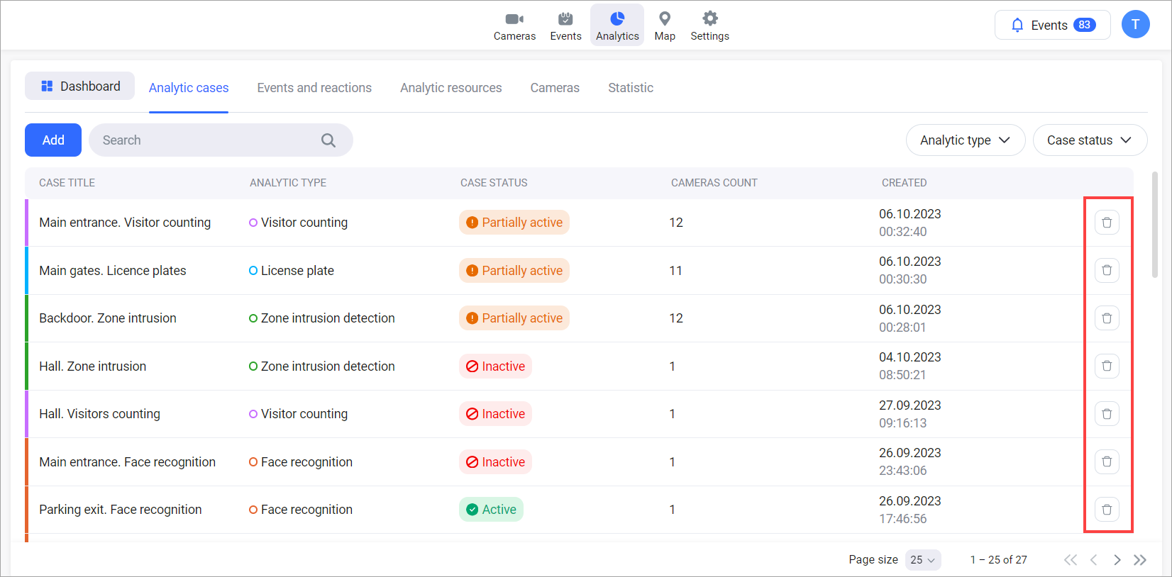 To delete an analytics case, select the Delete button of a relevant case.
