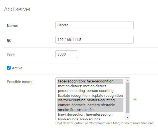 The Possible cases field contains all analytics types added in Case types by default. To specify which analytics types the server needs to process, select them with the mouse or using the Ctrl (Command on Mac) + left mouse button shortcut. To add a new analytics type, click on the add icon to the right of the field ➕.