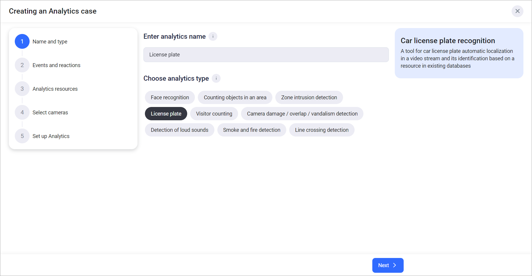 Select the License plate analytics type from the list.