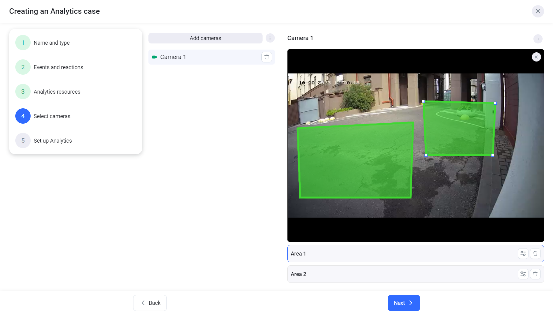 Select the camera name to open it. On the opened camera image, left-click to draw the lines of the area. The lines of the areas should not intersect. Connect the last and first points to create the recognition area. The area will be highlighted green when ready.