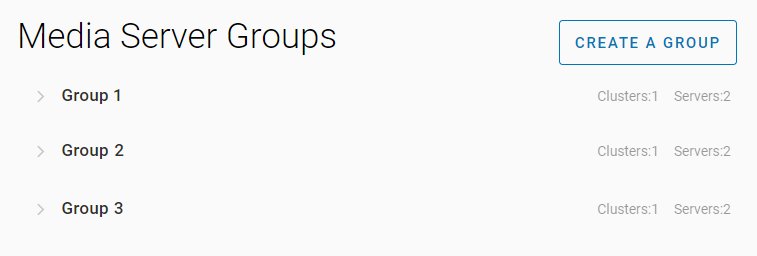 In the section, you can find a list of existing groups. For each group, the number of clusters and media servers included in it is shown.
