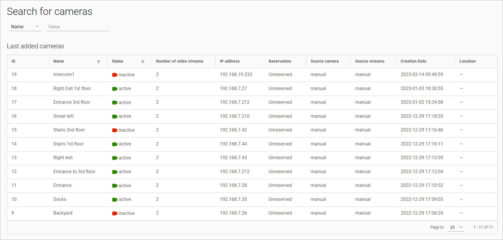 The Search section lists all cameras. By default, cameras are listed in descending order based on their creation date. The most recently created cameras appear at the top of the list.