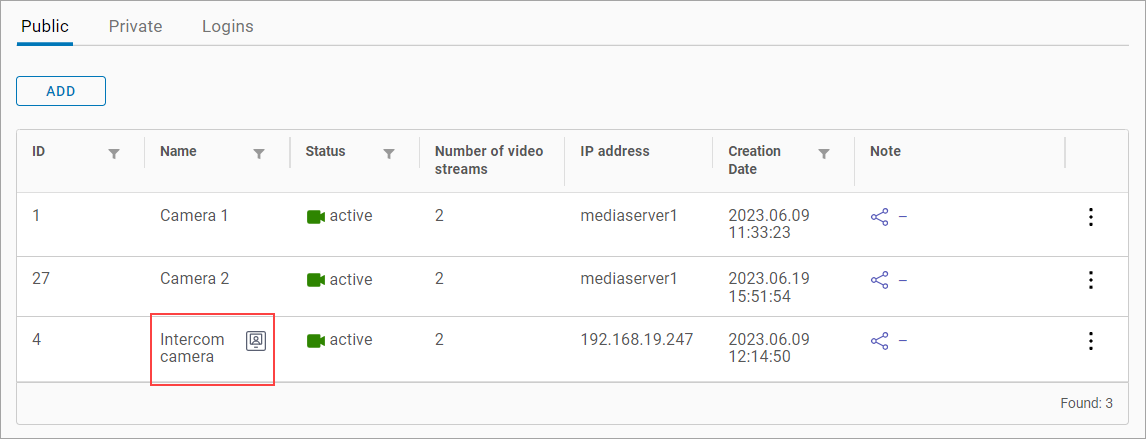 When the Intercom Camera setting is enabled for a camera, this camera in the list is indicated with a special icon, as on the image below.