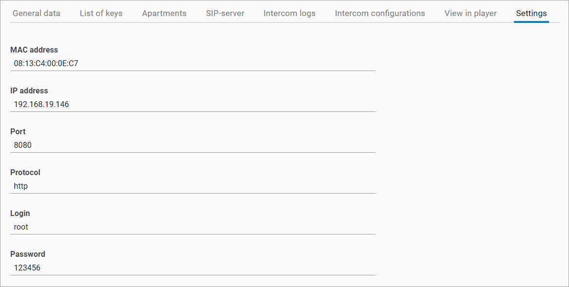 On the Settings tab, you can only view the intercom connection settings and can’t edit them.