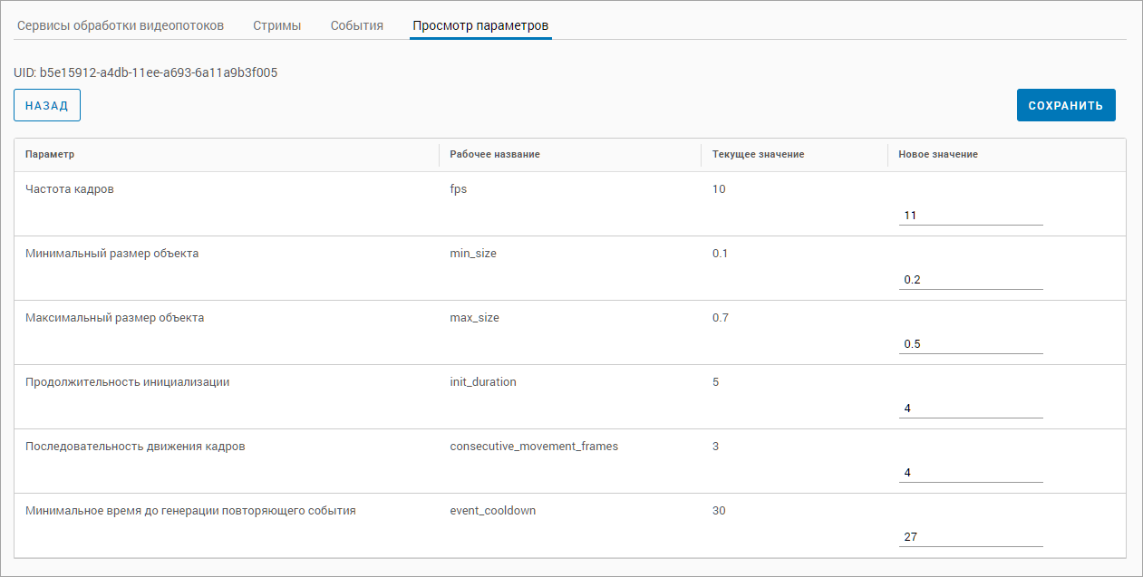 При необходимости укажите новые значения в соответствующей колонке и нажмите «Сохранить». В результате новые значения будут применены только для данного видеопотока в определенном кейсе аналитики.