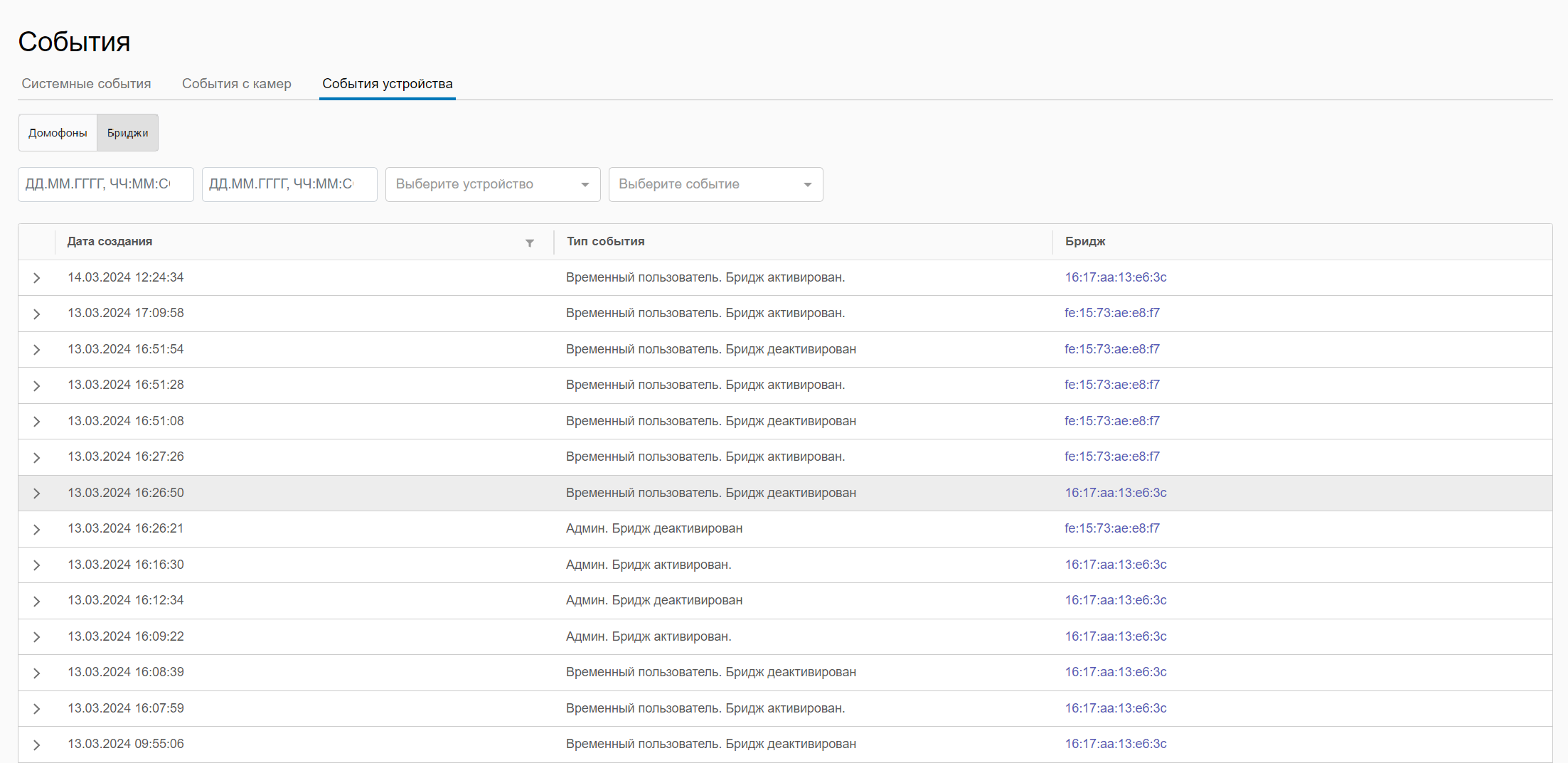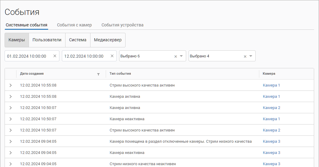 Здесь отображаются события, которые относятся к созданию, обновлению, удалению камер, изменений статусов видеопотоков.
