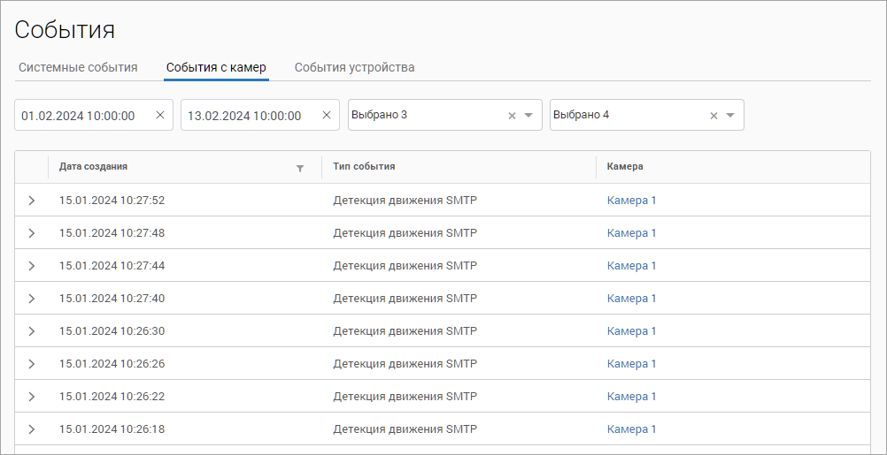 На вкладке «События с камер» отображается список событий SMTP, получаемых с камеры по протоколу ONVIF.