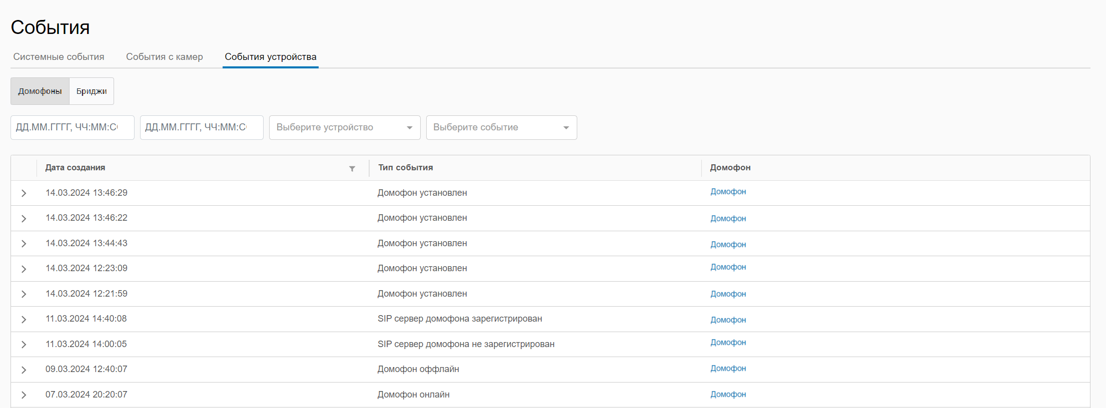 Предусмотрены следующие события по домофонам для разного уровня пользователей: