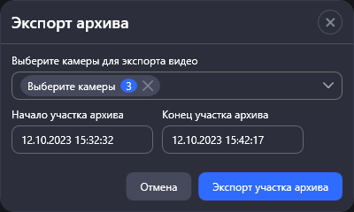 В данной форме можно отредактировать количество камер, с которых будет производиться выгрузка архива. Также возможно внести изменения в дату и время участка архива.