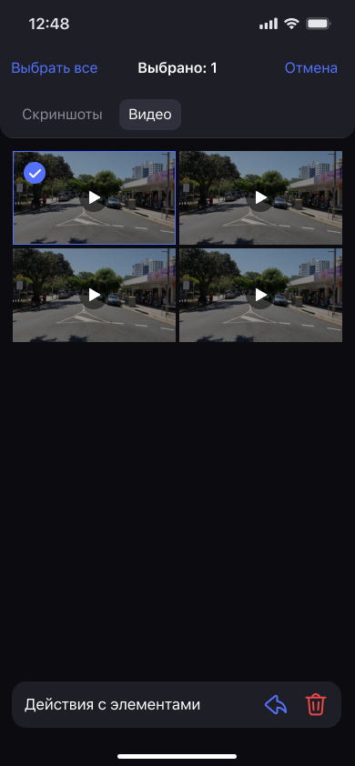 Нажмите необходимые видео, чтобы их выбрать. Для выбора всех видео нажмите «Выбрать все» в левом углу вкладки «Видео».