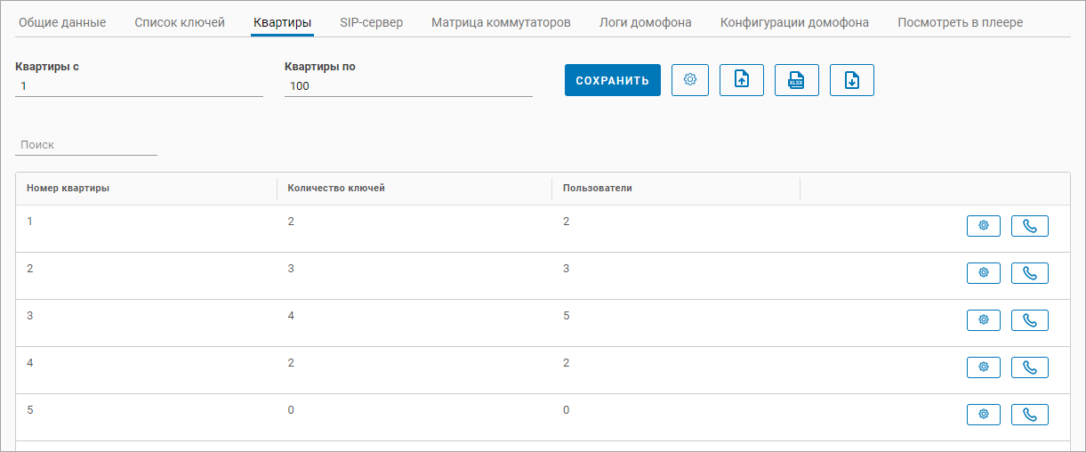 Для настройки квартир. Предусмотрена как общая настройка всех квартир, так и отдельная настройка каждой квартиры. Подробное описание настроек приведено в разделе «Настройки квартир»