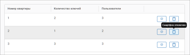 В таблице для каждой квартиры предусмотрен набор функций. При наведении курсора на кнопку отображается подсказка: