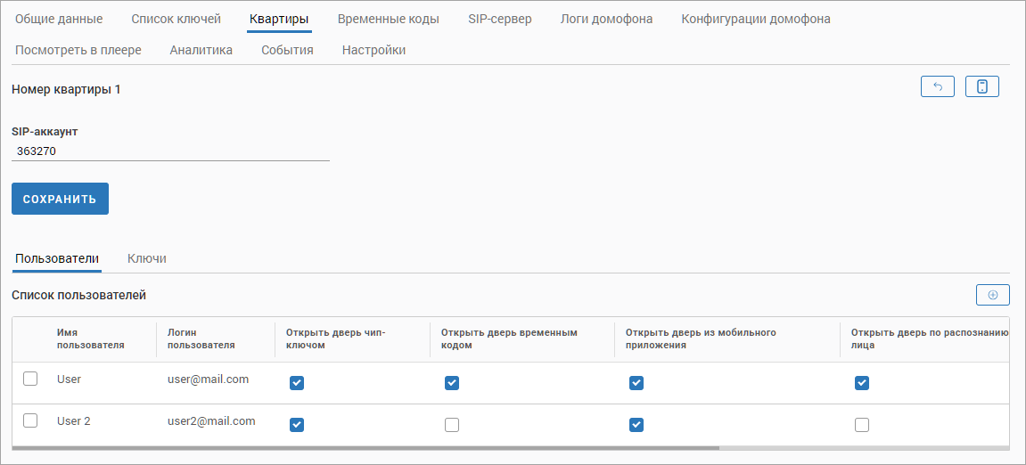 В таблице «Список пользователей» отображается список пользователей, привязанных к данной квартире.