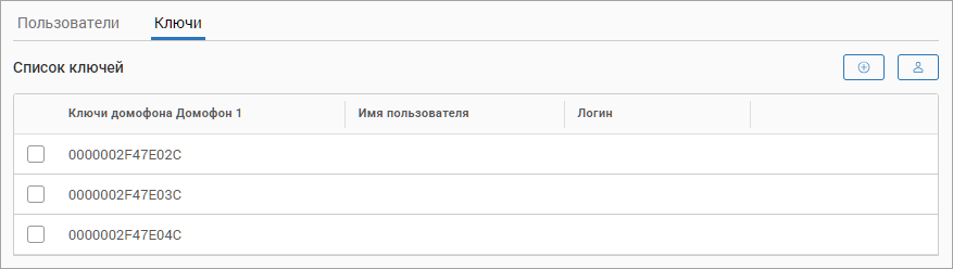 В таблице «Список ключей» отображается список ключей домофона, привязанных к данной квартире. Создание новых ключей осуществляется на вкладке настроек домофона «Список ключей».