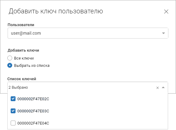 Вы можете привязать одному пользователю все доступные ключи или выбрать ключи из списка.