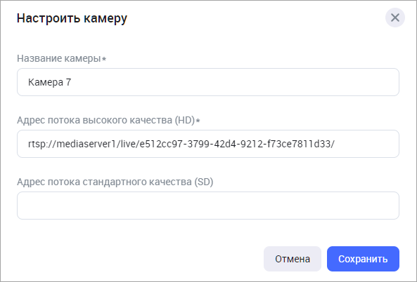 Поля «Название камеры» и «Адрес потока высокого качества (HD)» обязательны к заполнению.