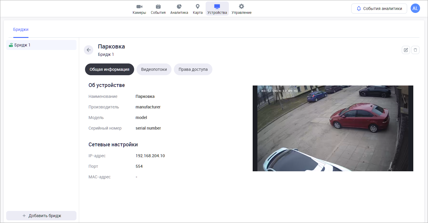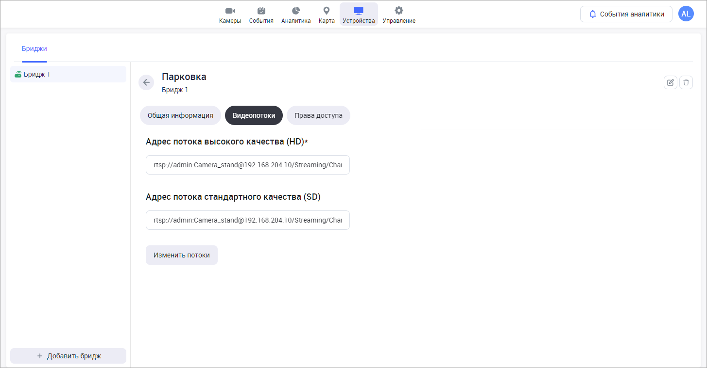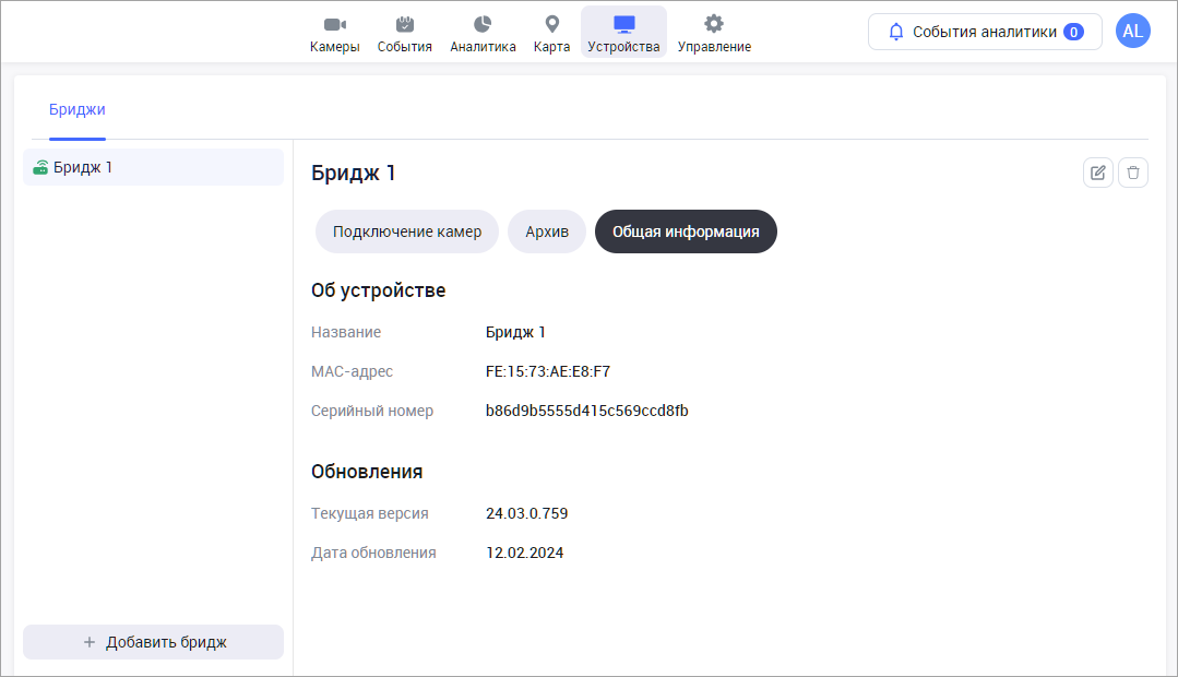 При нажатии на название бриджа отображается информация с вкладки «Подключение камер».