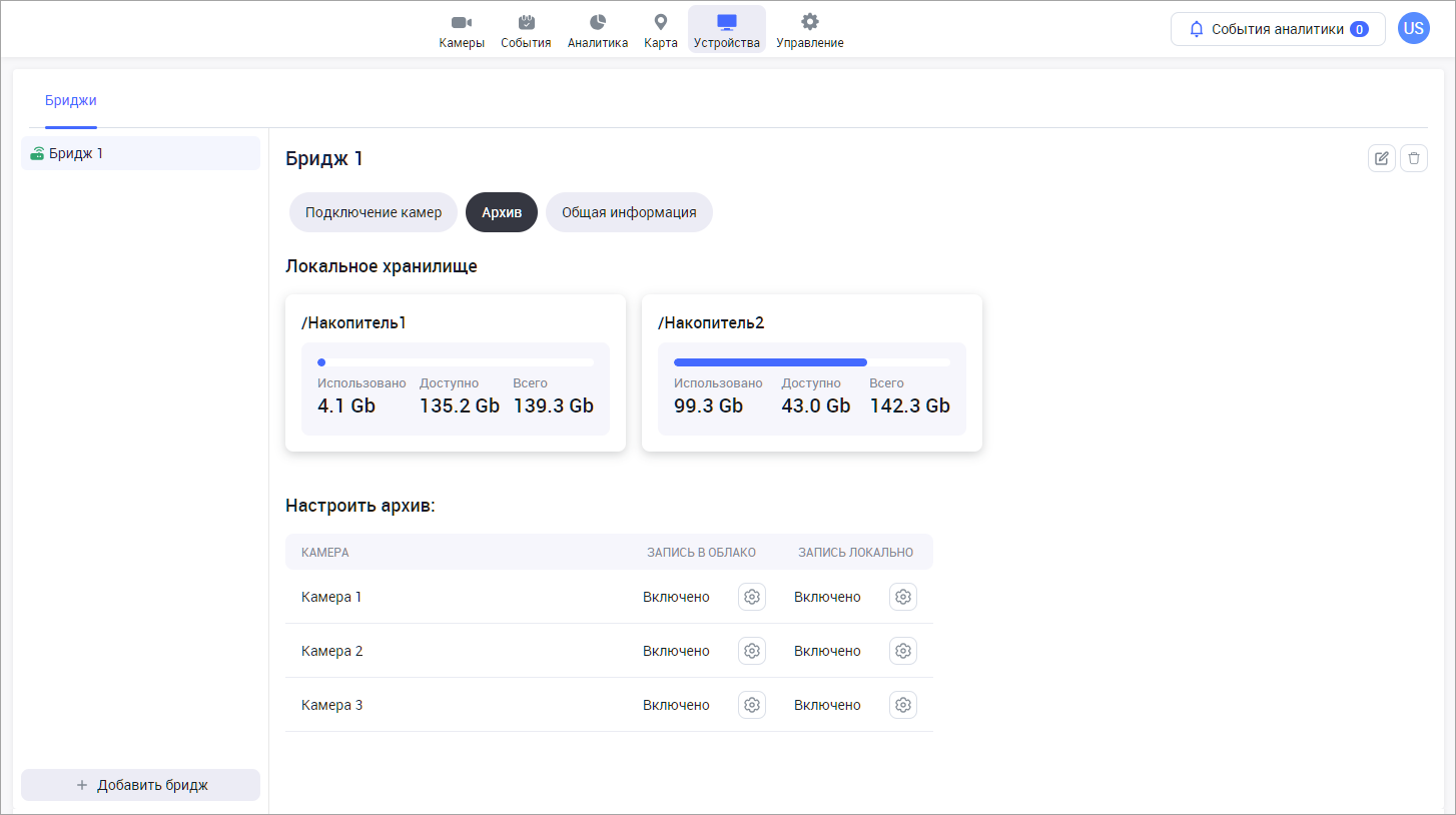 В секции «Локальное хранилище» отображается список локальных хранилищ, подключенных к бриджу.