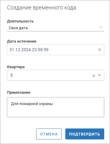 На вкладке «Временные коды» вы можете создать код с ограничением действия по времени и сообщить его своим посетителям. Это позволит им открывать дверь самостоятельно.
