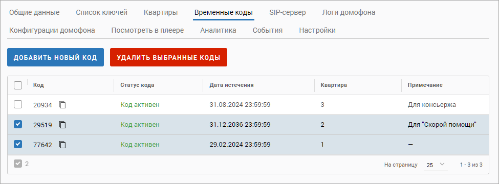 Для удаления выделите один или несколько кодов, нажмите «Удалить выбранные коды» и подтвердите удаление.