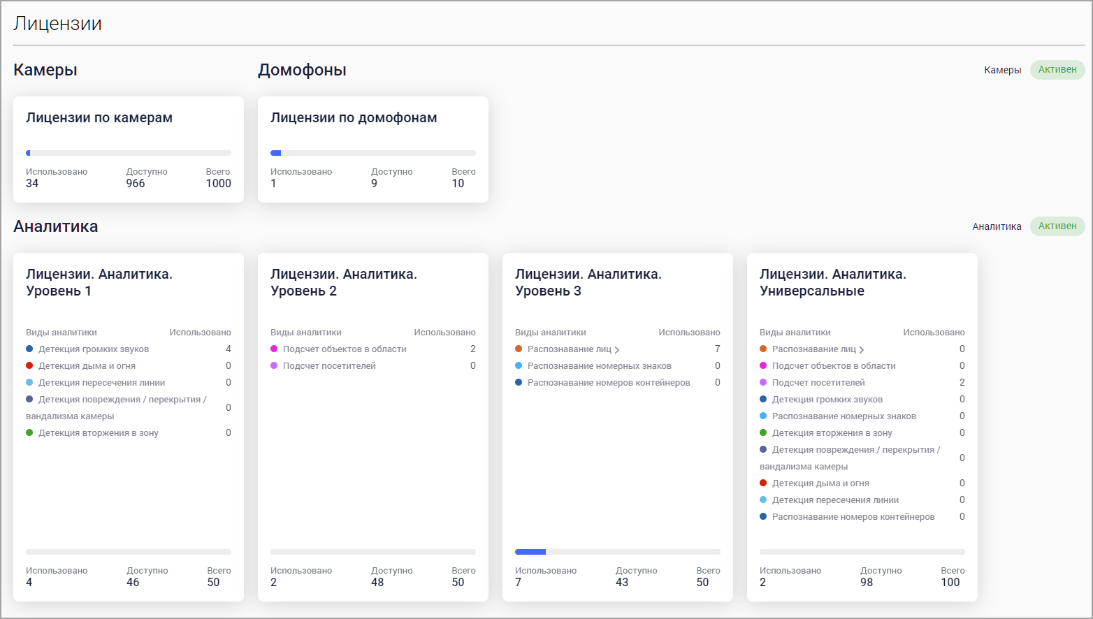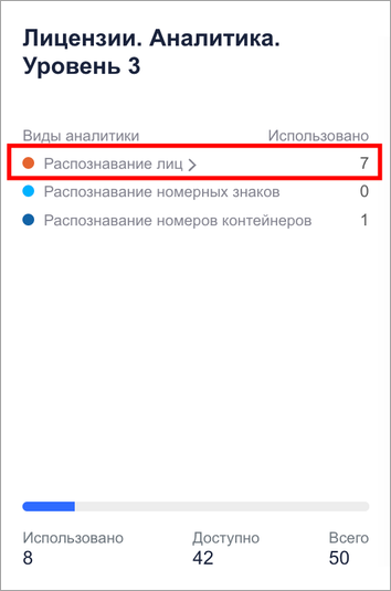 Виды аналитики, доступные в рамках лицензии данного уровня. Для каждого вида аналитики указывается количество задействованных лицензий