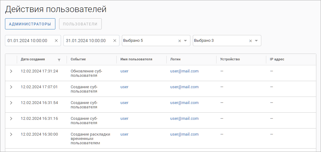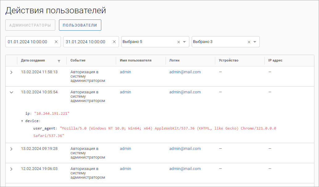 Раздел «Действия пользователей» предназначен для логирования и отображения действий пользователей в системе.