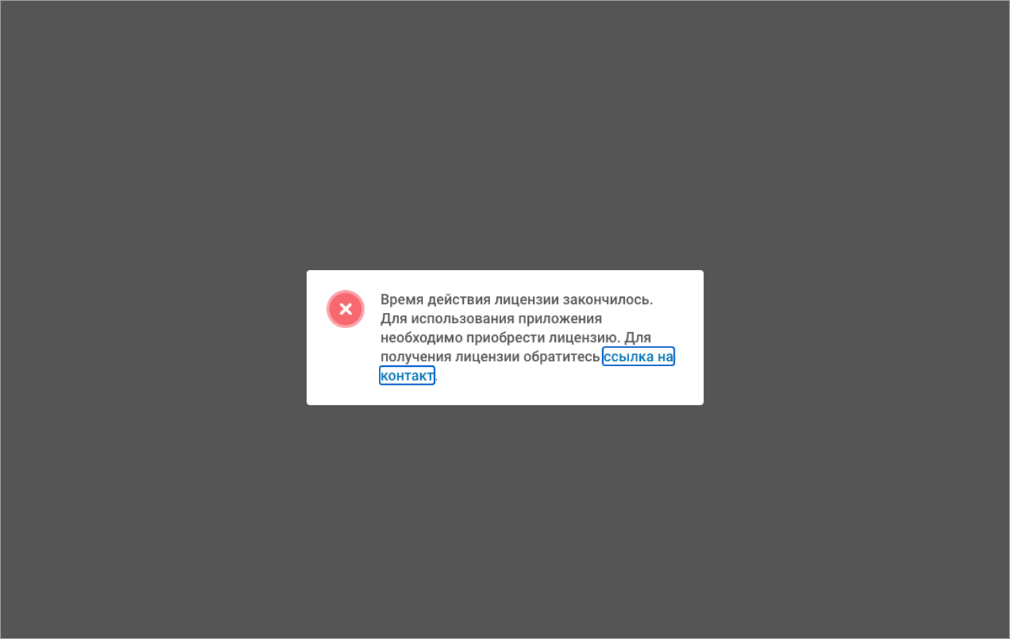 После окончания срока действия лицензии система блокируется. На экране отображается соответствующее сообщение, включающее контактные данные сотрудника поддержки:
