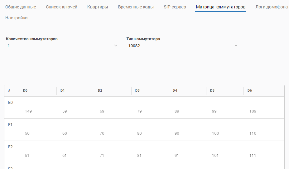 Вкладка «Матрица коммутаторов» домофона «Бевард»