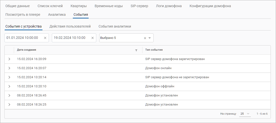 В верхней части страницы отображается панель с данными домофона и набором функций: