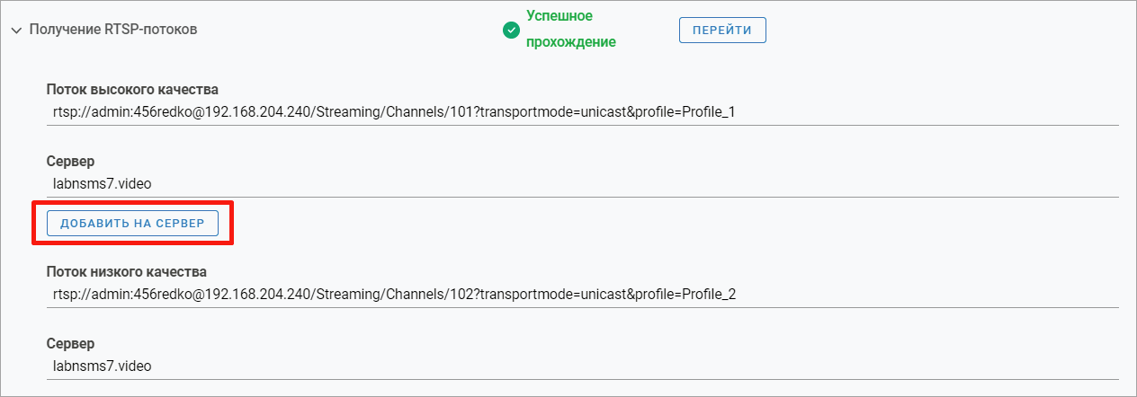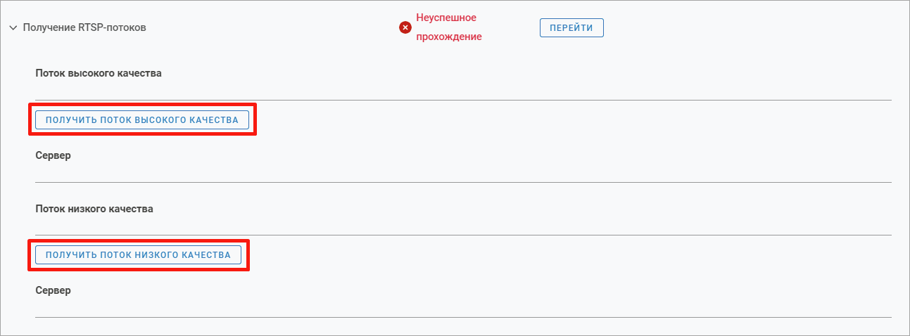 В случае неуспешного прохождения этапа отображаются кнопки «Получить поток высокого качества» и «Получить поток низкого качества» для принудительного получения адресов потоков.