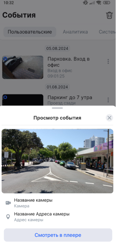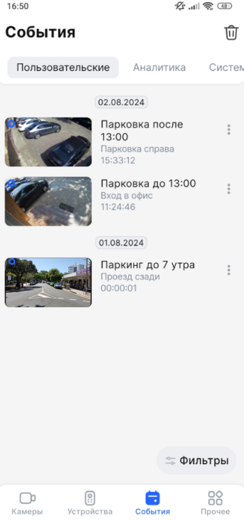 События, добавленные пользователем при просмотре архива камер в мобильном приложении и в web-интерфейсе пользователя. Добавить новое пользовательское событие возможно при просмотре камеры. Детально в разделе «Добавить пользовательское событие».