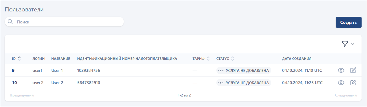 Для перехода в карточку B2B-пользователя нажмите на значение в колонке ID либо на кнопку просмотра188.png в строке.
