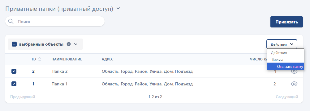 • В карточке последнего элемента адреса в блоке «Связанные устройства: Камеры (приватные папки)».