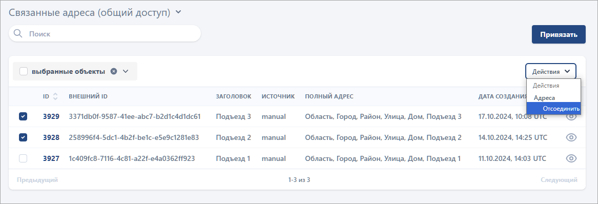 • Выделите один или несколько адресов, которые вы хотите отвязать.