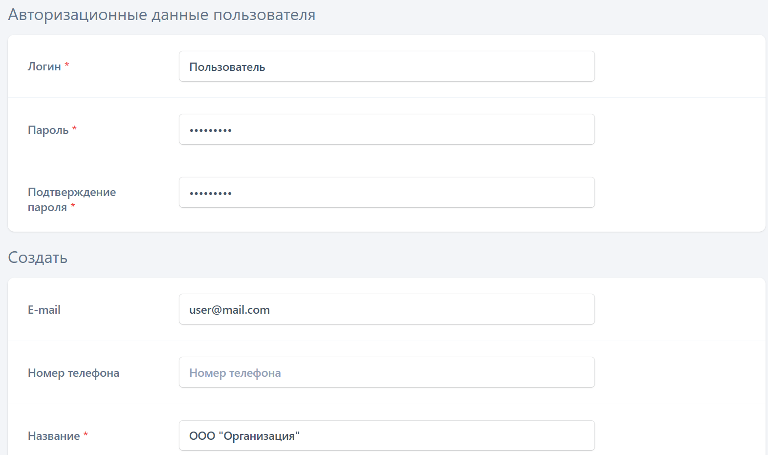 1. На открывшейся странице заполните поля в разделах «Авторизационные данные пользователя» и «Создать».