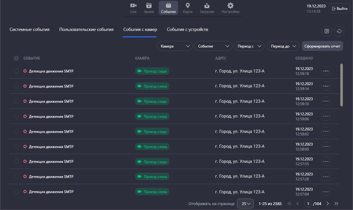 На вкладке «События с камер» отображаются следующие события, полученные с камер:
