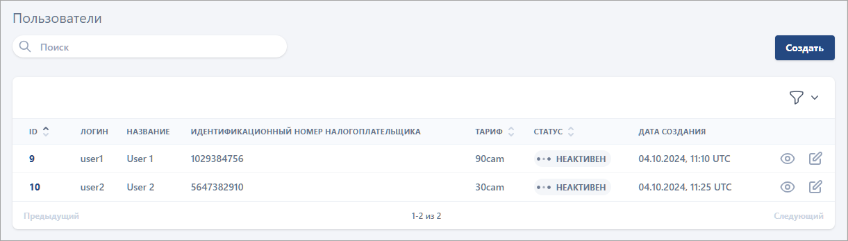 В результате пользователю прикрепляется тарифный план. На текущем этапе статус тарифного плана – «Неактивен».