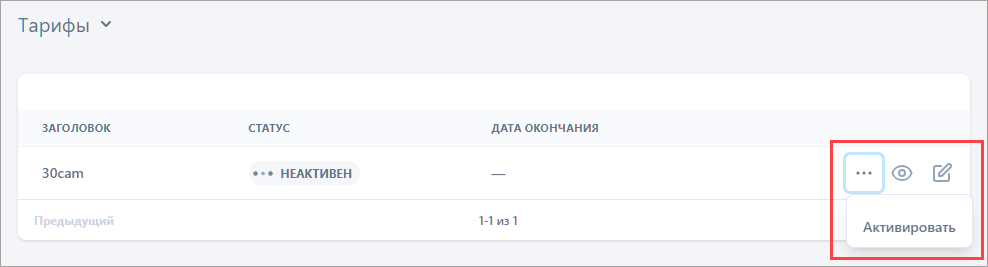В разделе «Тарифы» в строке с неактивным планом нажмите на «…» для вызова контекстного меню и выберите пункт «Активировать».