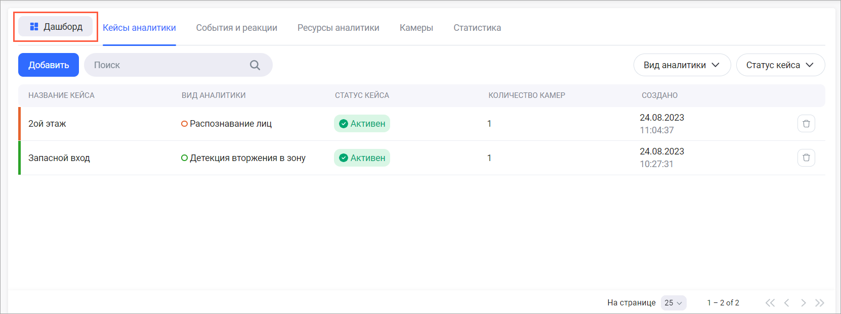 Общее количество камер, задействованных во всех кейсах с данным видом аналитики. При нажатии на число выполняется переход на вкладку «Камеры», где отображается список камер с фильтрацией камер по виду аналитики