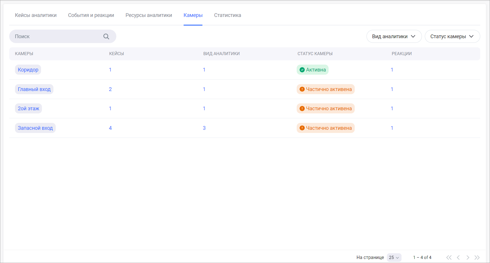 На вкладке «Камеры» отображается список камер, которые задействованы в кейсах аналитики.