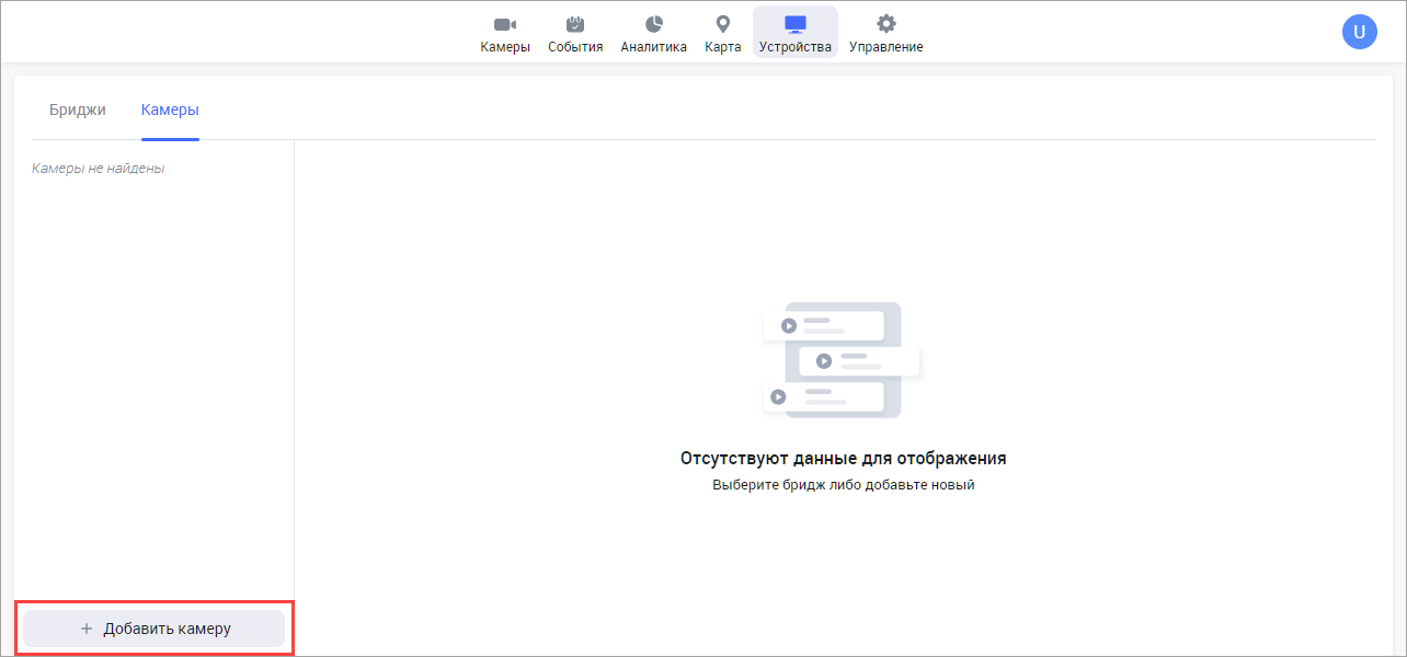 При первом входе в Web-интерфейс список не содержит камер. Для добавления устройства нажмите кнопку «Добавить камеру».