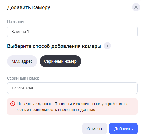 Если данные были введены неправильно или камера не подключена, то на форме добавления отобразится соответствующее сообщение: