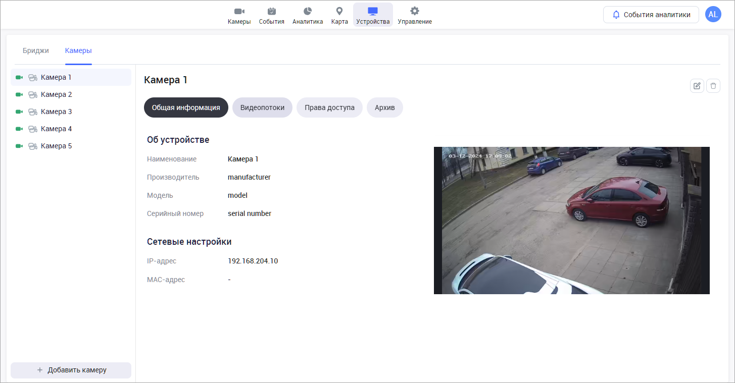 При нажатии на название камеры по умолчанию отображается вкладка «Общая информация».