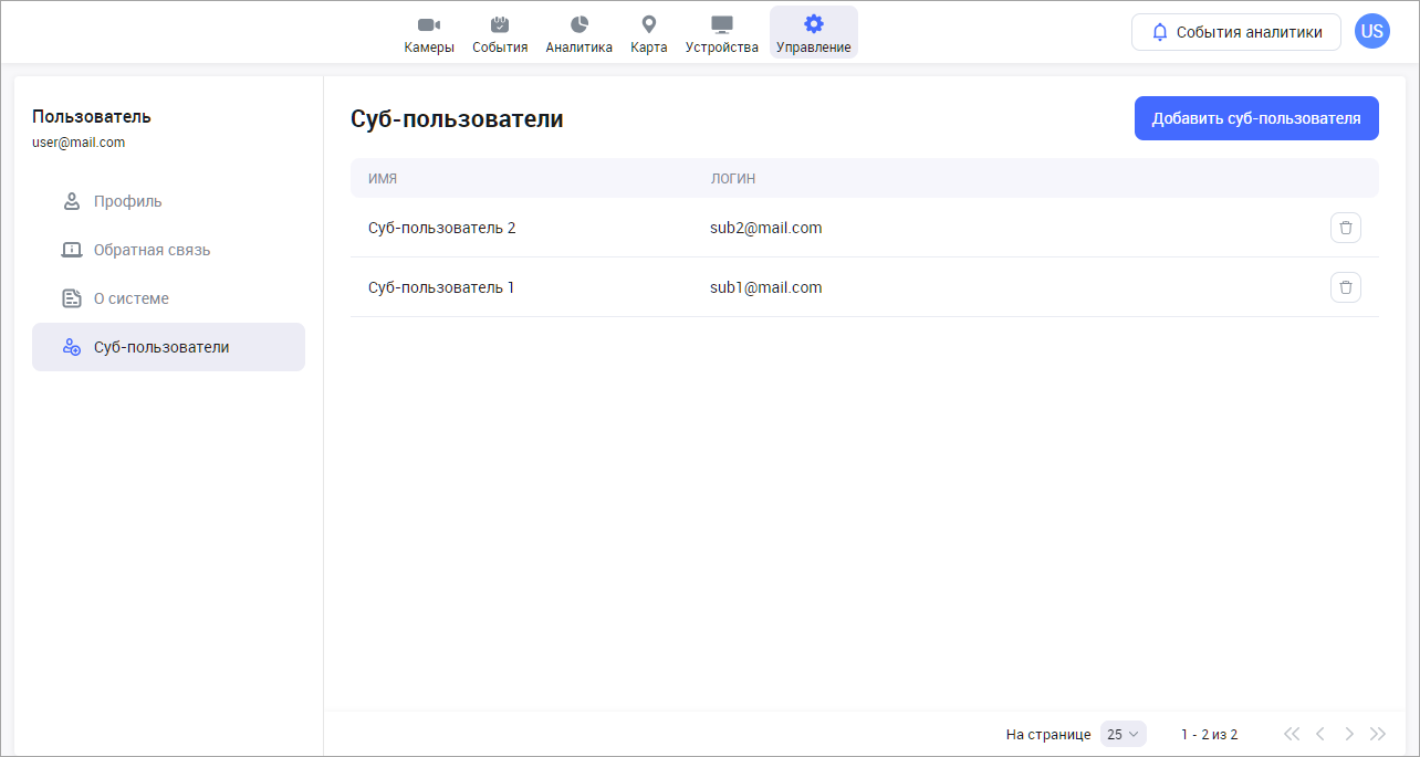 При переходе в подраздел отображается список суб-пользователей.