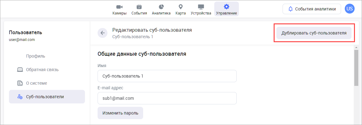 Предусмотрена функция дублирования суб-пользователя. Функция позволяет оперативно создать нового суб-пользователя с уже имеющимися настройками прежнего.