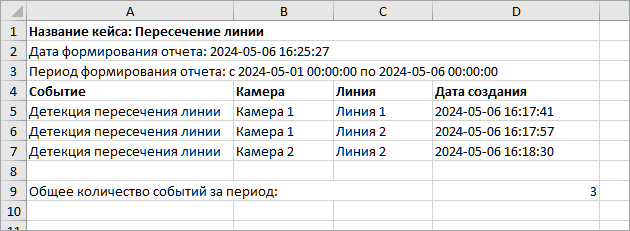 При просмотре кейса с видом аналитики «Детекция пересечения линии» отображается таблица, которая содержит изображение в момент события, название события, название камеры и дата создания события.