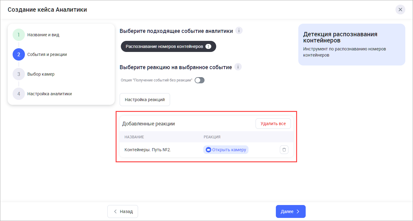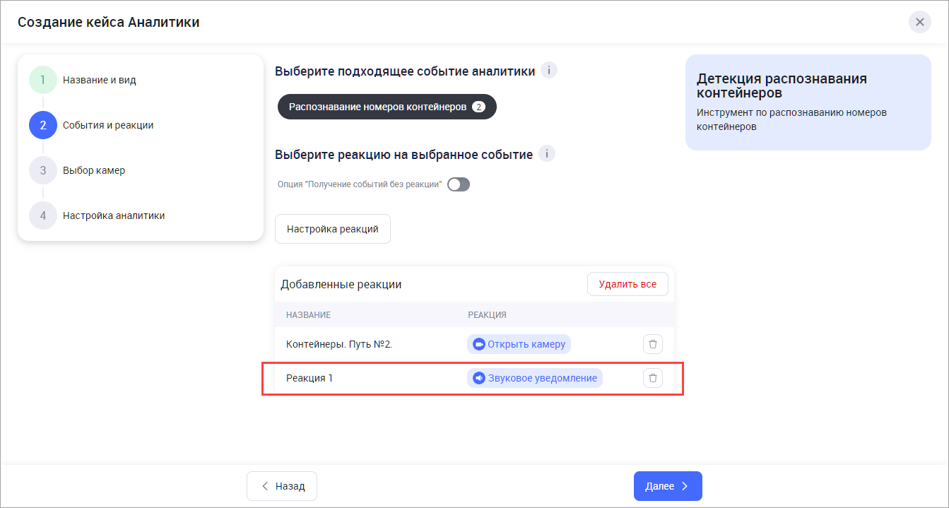 В результате выбранные реакции отобразится в списке добавленных реакций в текущий кейс аналитики. Впоследствии их также можно отключить либо удалить на Шаге 4 при добавлении либо редактировании кейса.