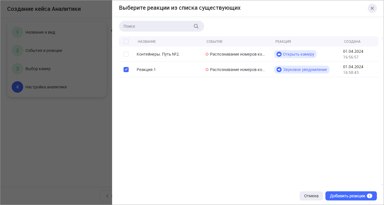 В результате выбранные реации отобразятся в списке реакций выбранного типа для текущего кейса. Для того, чтобы далее использовать созданную реакцию при настройке камер, нажмите «Добавить реакции».