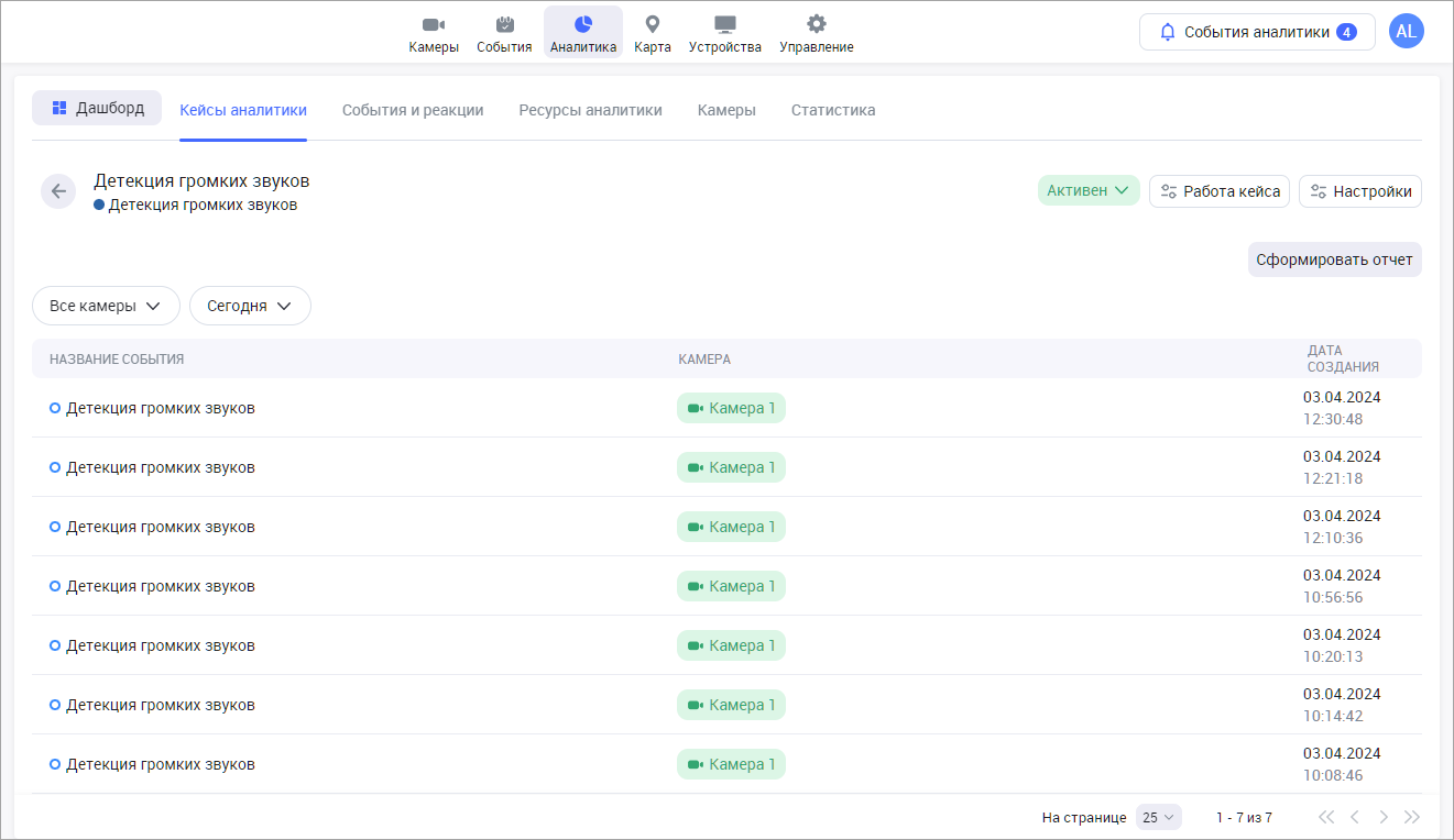 При просмотре кейса с видом аналитики «Детекция громких звуков» отображается таблица, состоящая из событий, камер, даты создания.